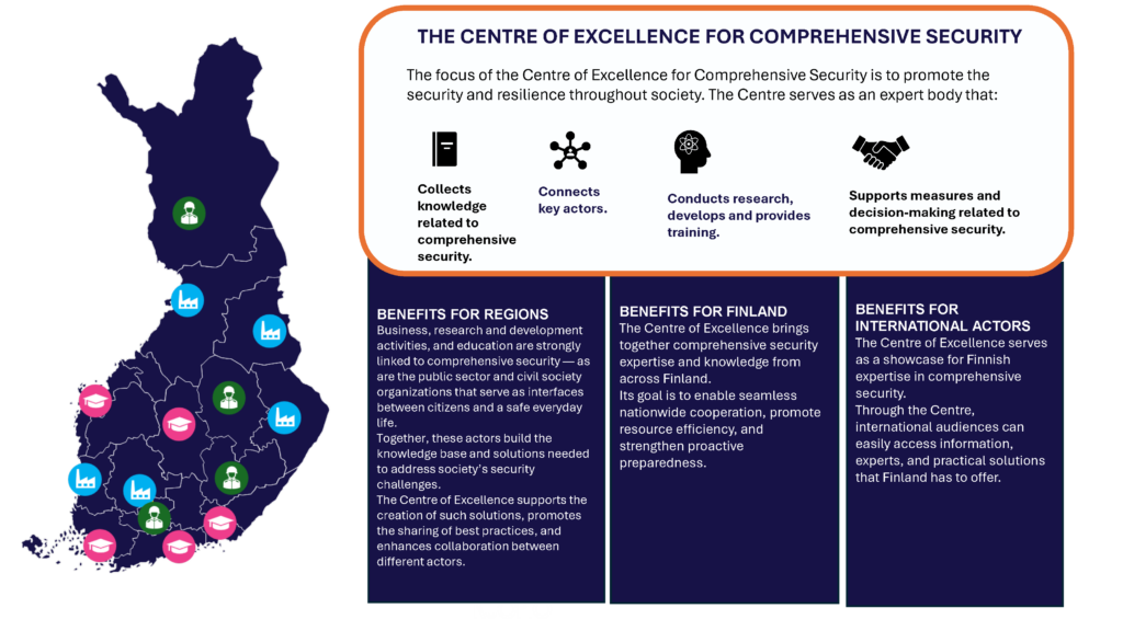 The Centre of Excellence for Comprehensive Security brings together sector-specific expertise and knowledge, strengthening cooperation between authorities, businesses, and civil society organizations. The Centre advances the development of comprehensive security and crisis preparedness and enables the creation of large-scale, integrated project initiatives. Its operations are based on resource-wise, efficient collaboration for the benefit of society as a whole.